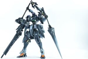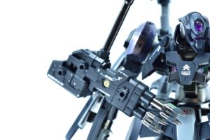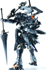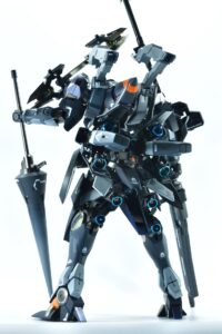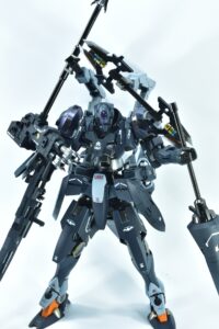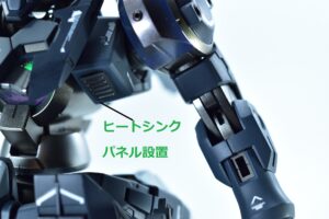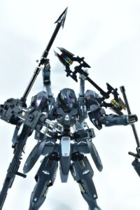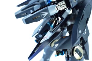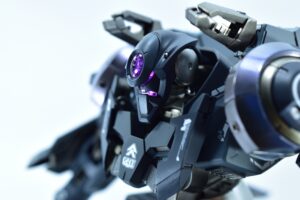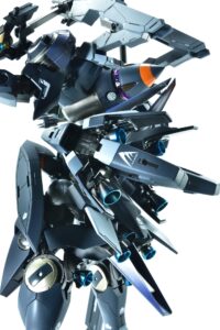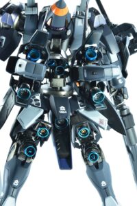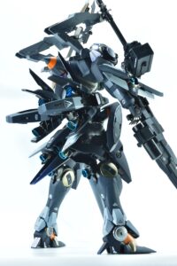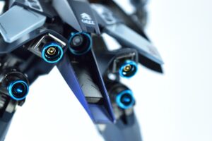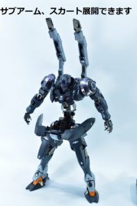 背面を中心に各箇所にバーニアを追加。ダークなカラーリングに反射するメタルパーツが機体全体の精密さを引き立てます。 - ショルダーアーマーのサブアーム搭載
