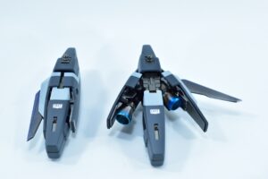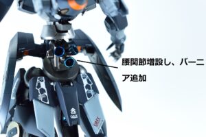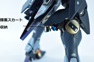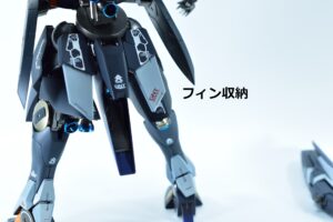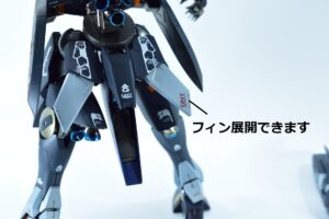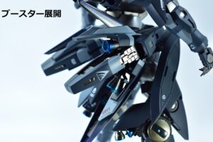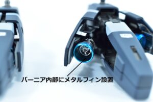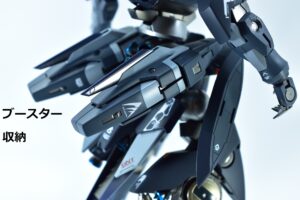 延長した腰部に大型ブースターを設置。背面バーニアと合わせて高機動型の特徴を強調しました。塗装はメタリック仕上げで、リアルな質感を演出しています。 - バーニアの増設