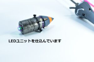 GNドライブにLEDを組み込み、点灯ギミックを追加。暗いカラーリングの中で光る緑が、不気味さと未来感を強調します。