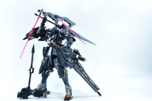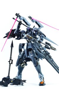 この作品は、シンプルなMGジンクスIIIをベースに、イメージを大胆に広げて製作した挑戦作でした。特に、胴体延長や追加武装の制作は試行錯誤の連続でしたが、高機動型らしいダイナミックな仕上がりに満足しています。