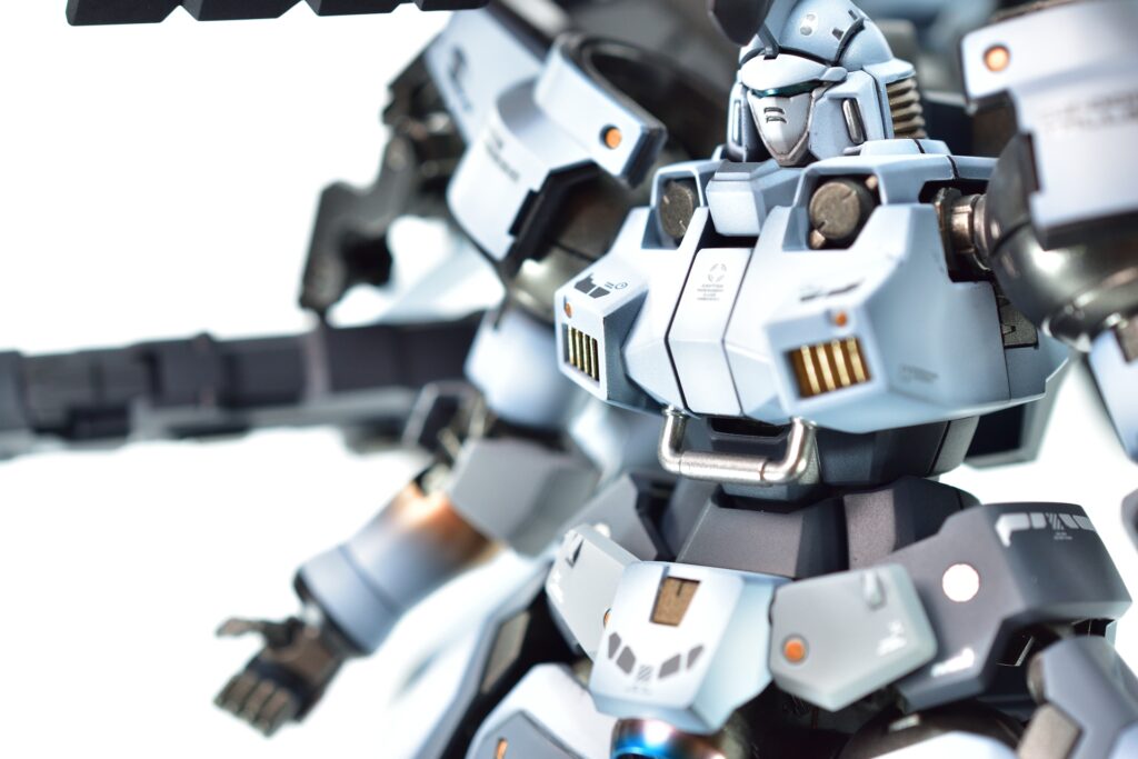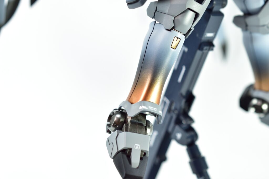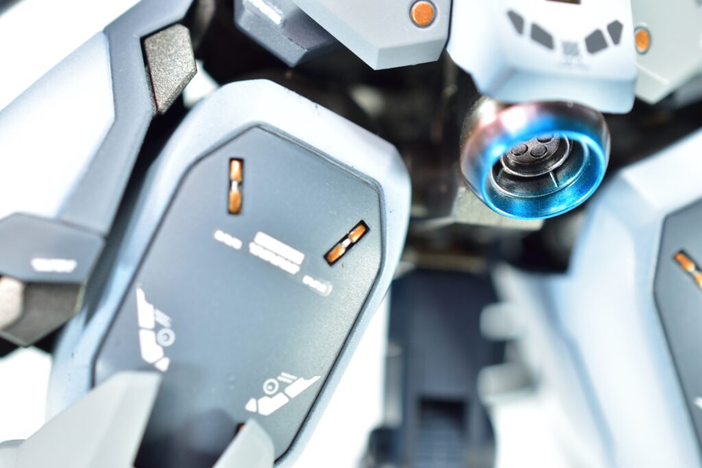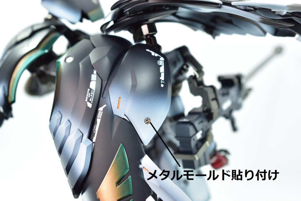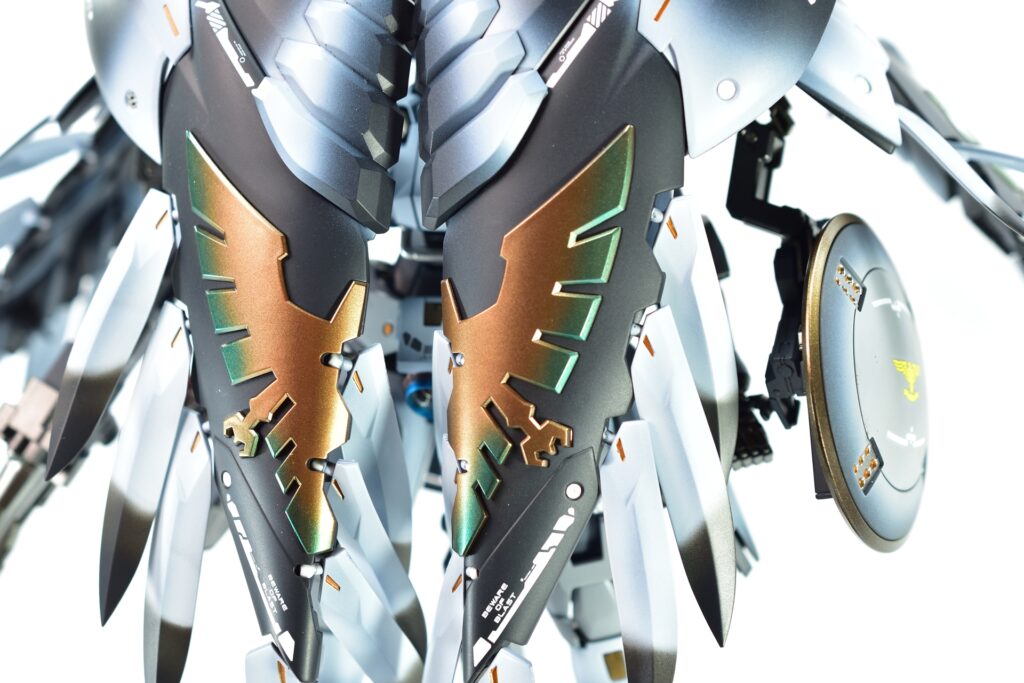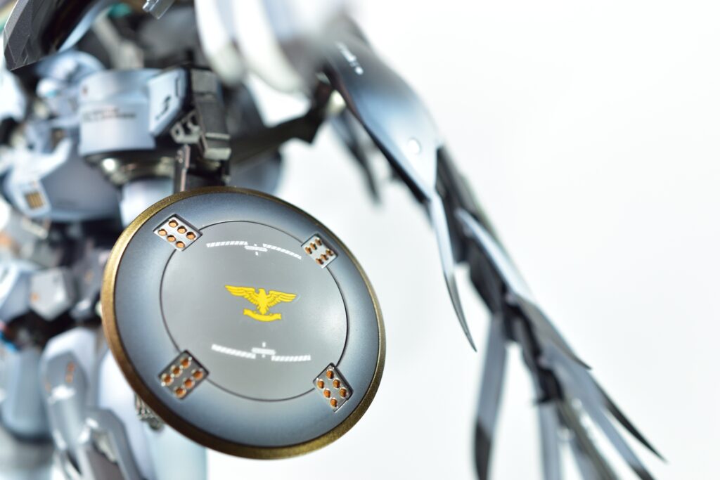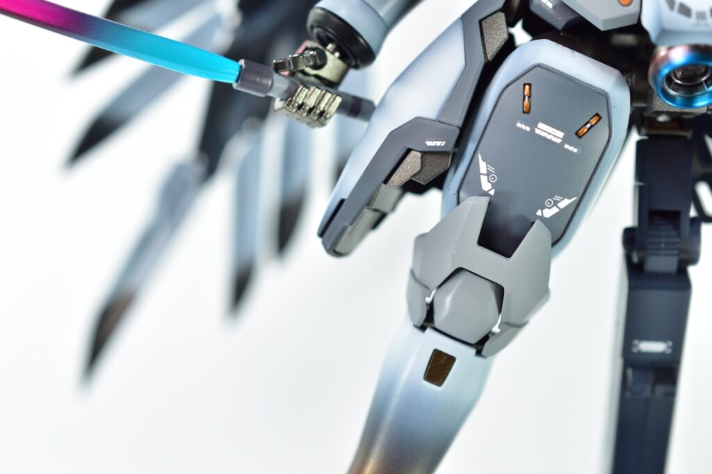 ウィングやスカートなど、各所にメタルパーツを貼り付け、高級感をプラスしました。特に、ウィング部分のメタルリングは光を受けてキラリと輝き、作品全体にアクセントを加えています。 - 3. スジ彫りとディテールアップ