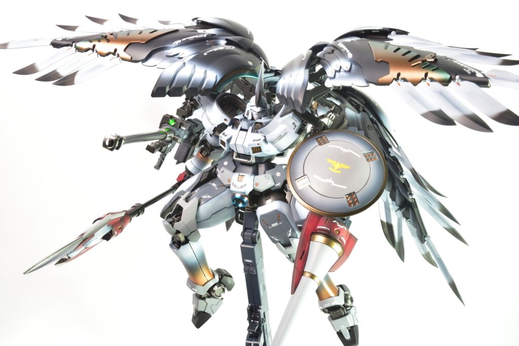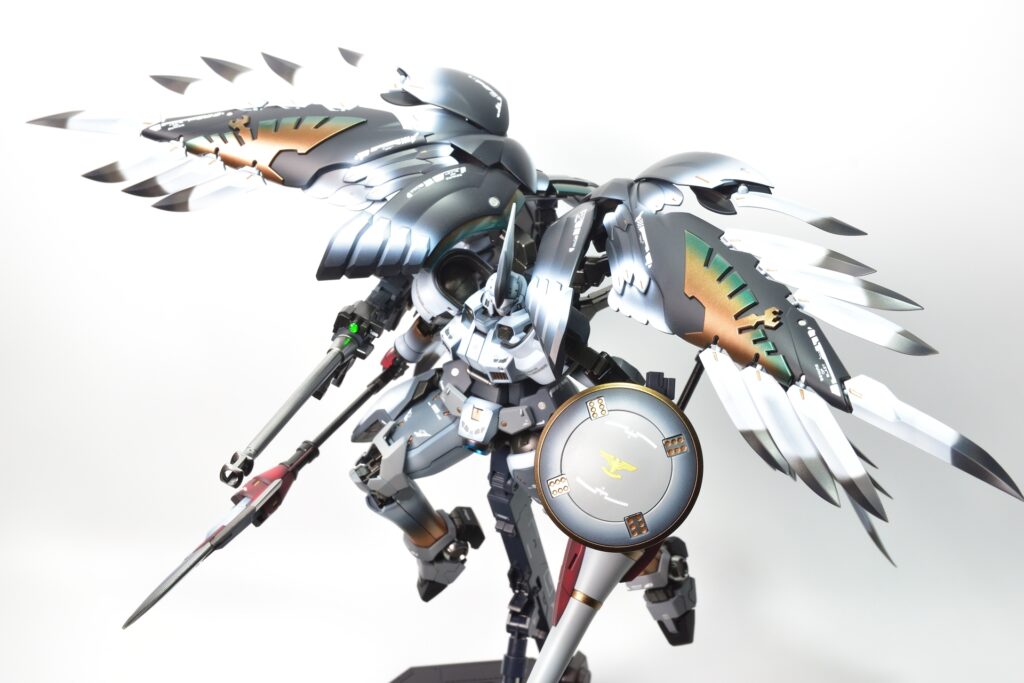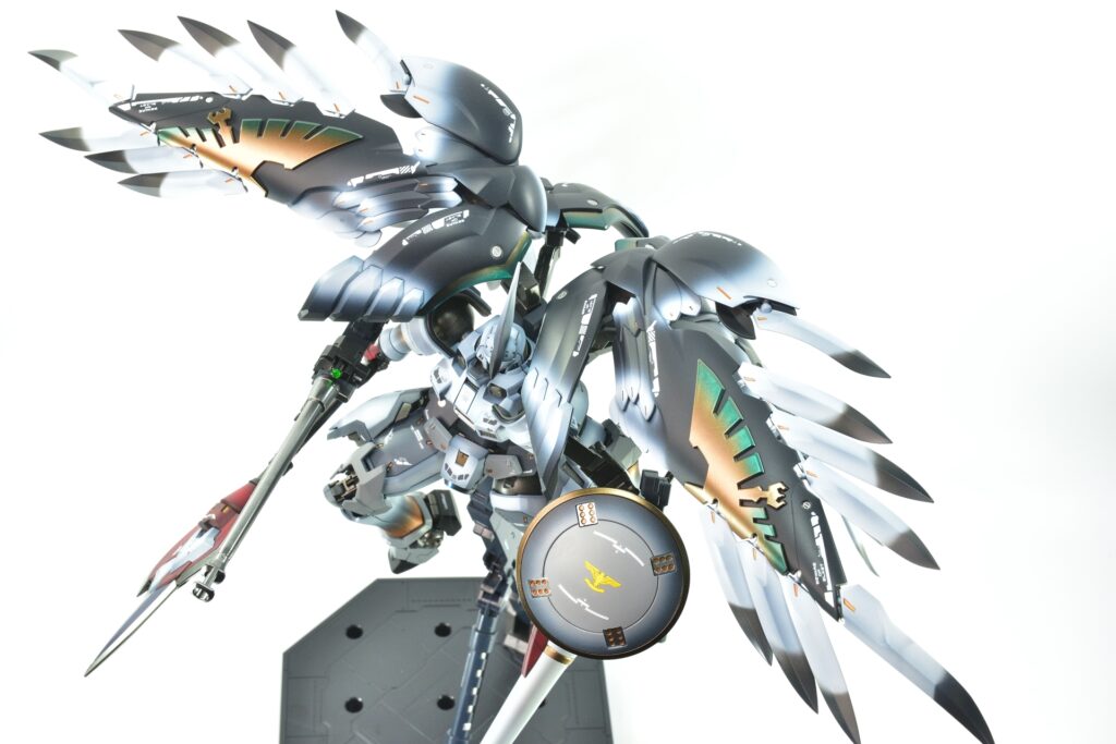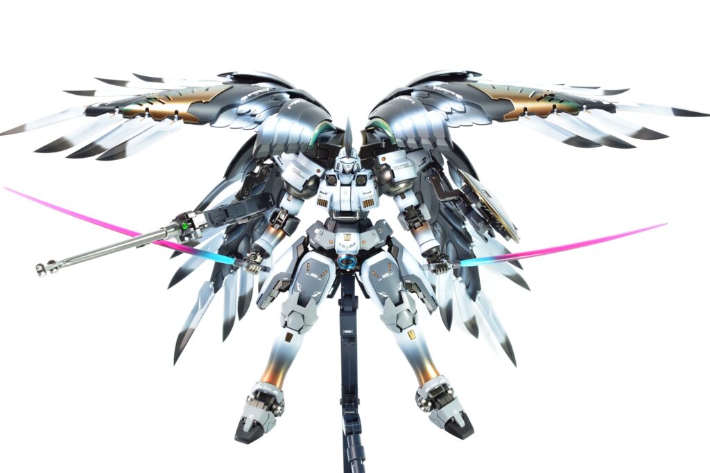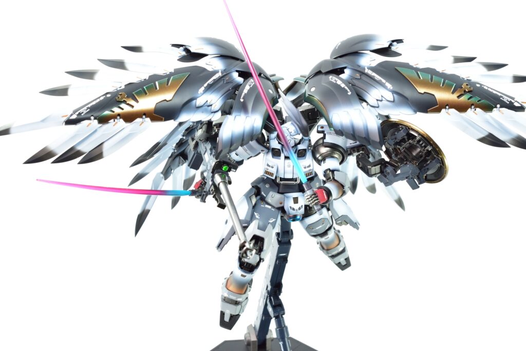 今回は、プレミアムバンダイ限定「トールギスF」をベースに、2体のキットを使用し、羽を計4枚に増やして製作しました。豪華さと神々しさを追求し、圧倒的な存在感を放つトールギスFを目指しました。