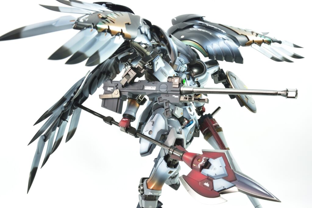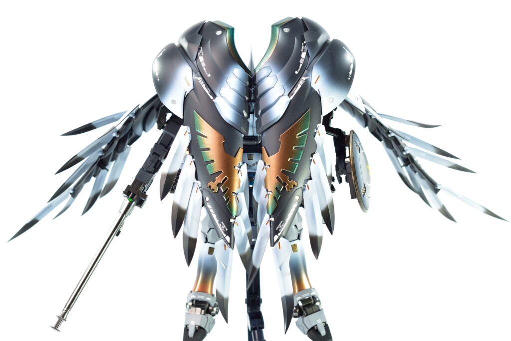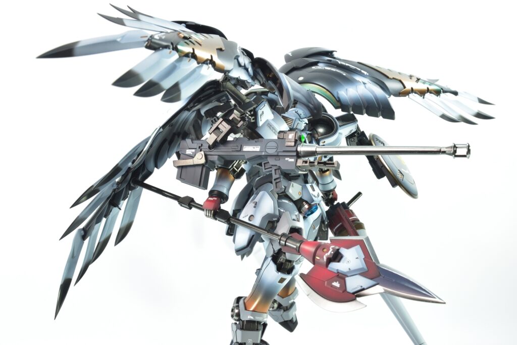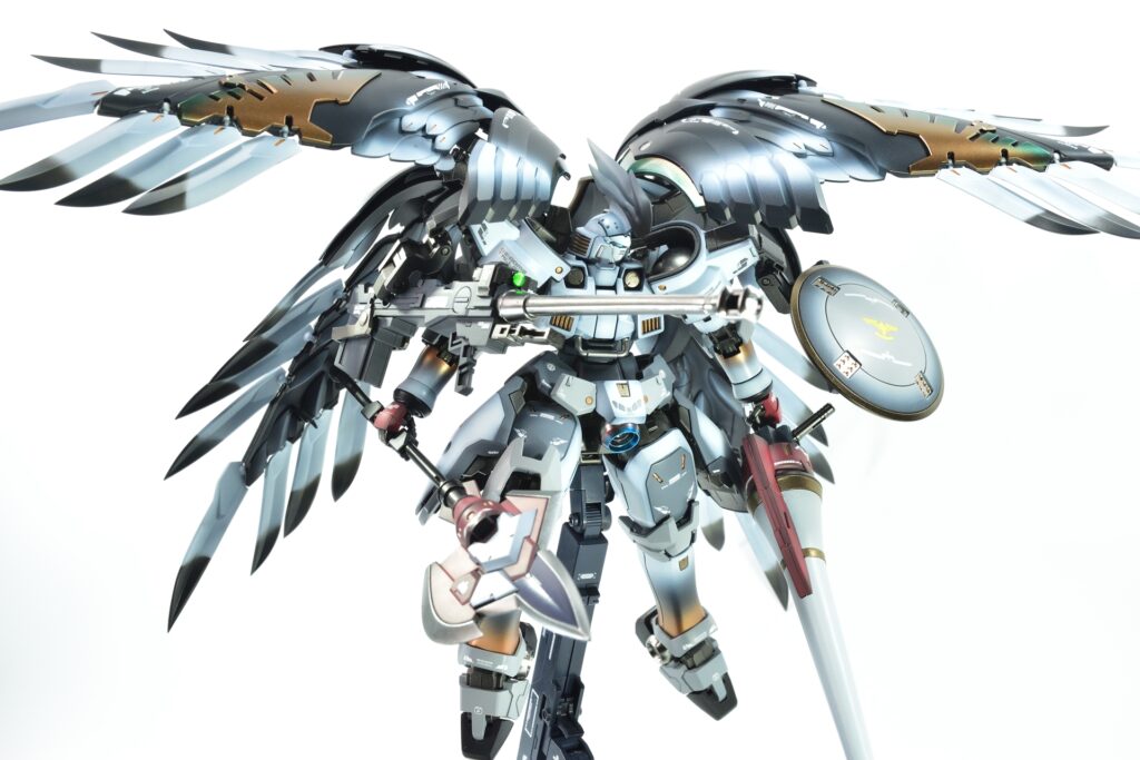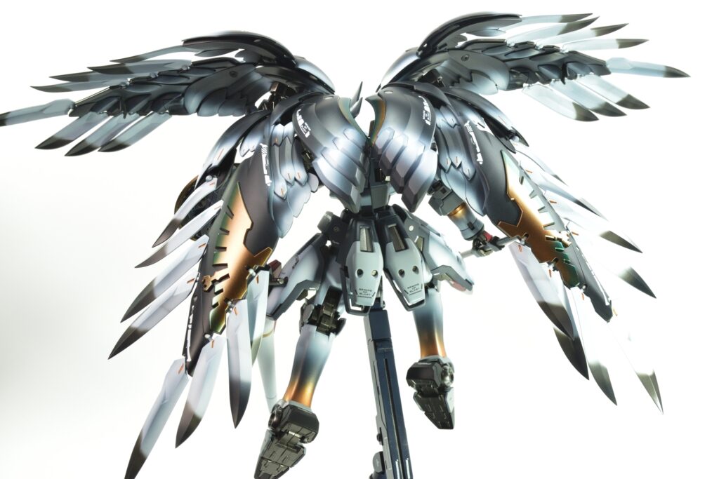 今回は、プレミアムバンダイ限定「トールギスF」をベースに、2体のキットを使用し、羽を計4枚に増やして製作しました。豪華さと神々しさを追求し、圧倒的な存在感を放つトールギスFを目指しました。