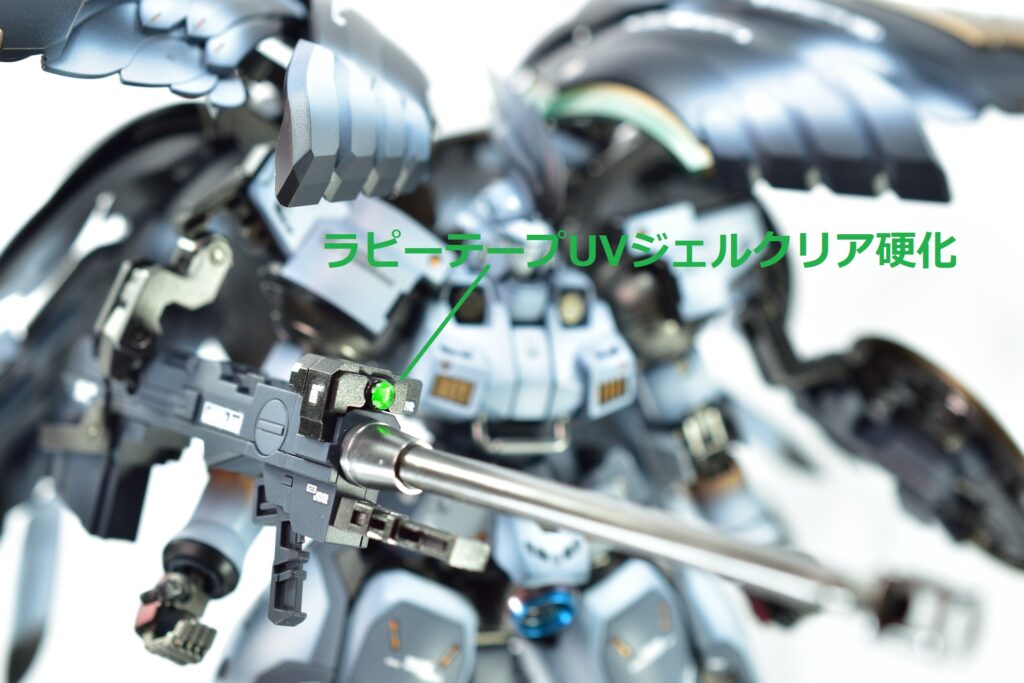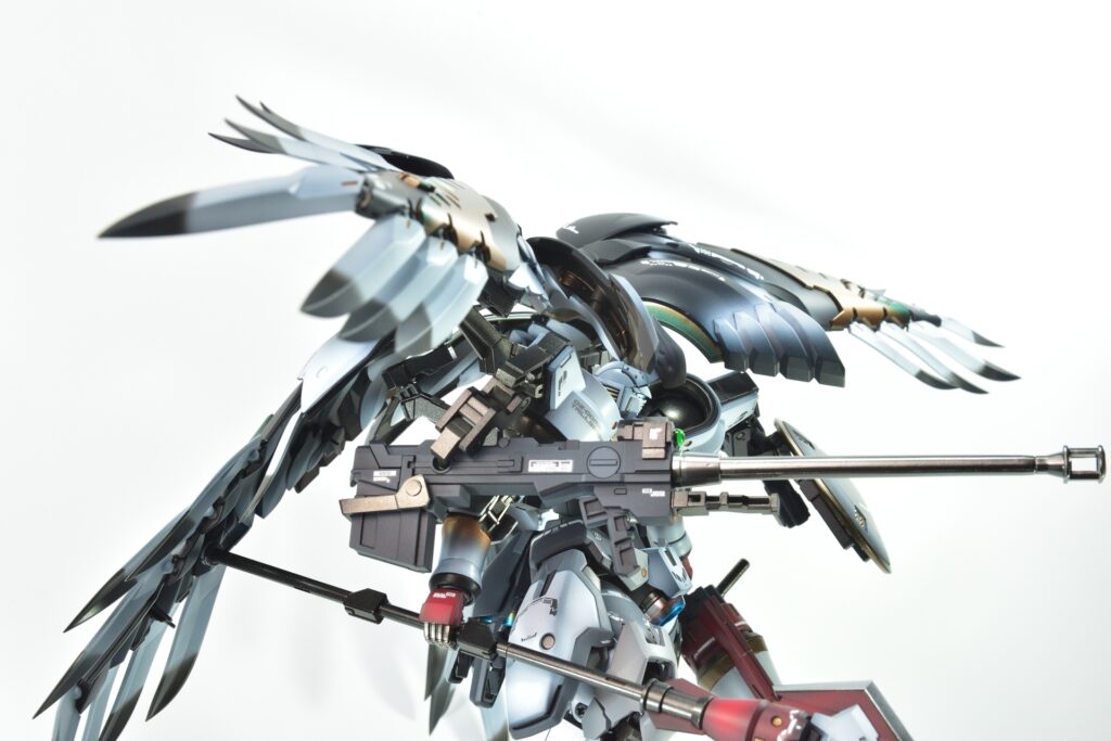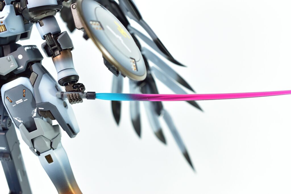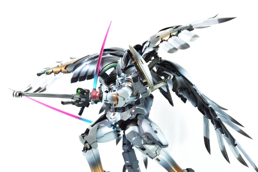 各パーツにグラデーション塗装を採用。ウィングは根元から先端にかけて紫から白への美しいグラデーションを作り、神聖さを表現しました。塗装はエアブラシを駆使し、丁寧に重ね塗りをしています。