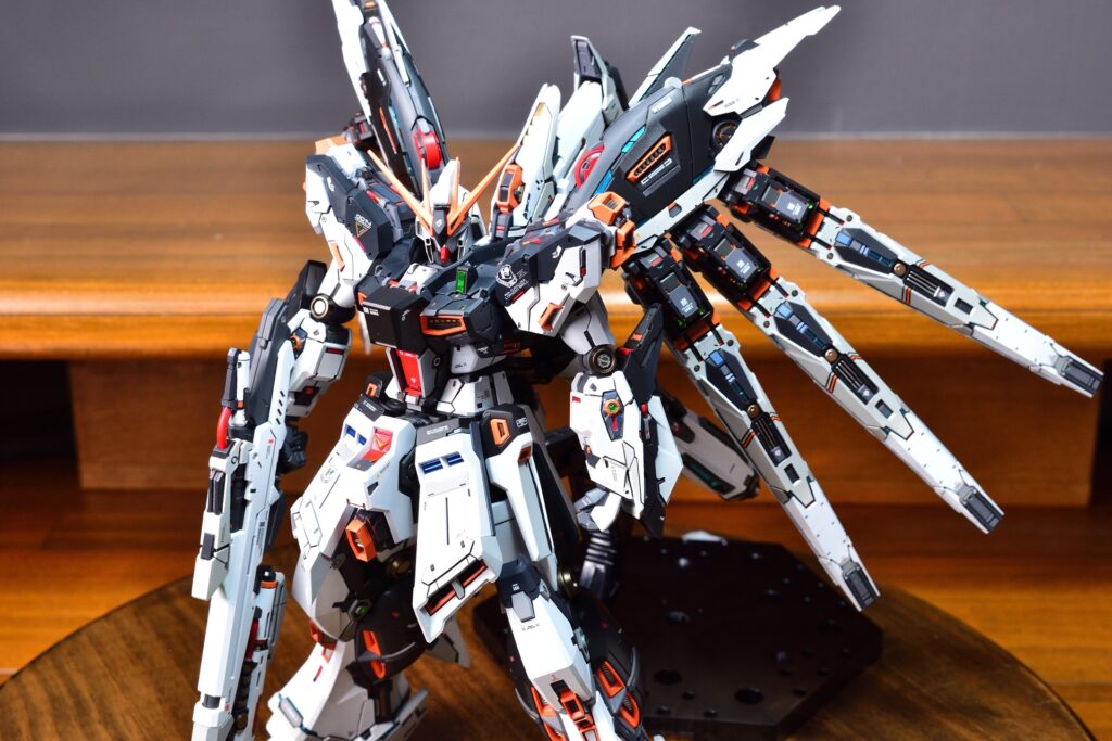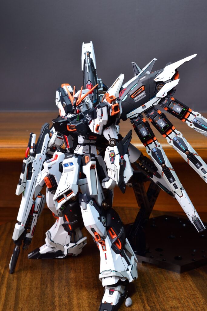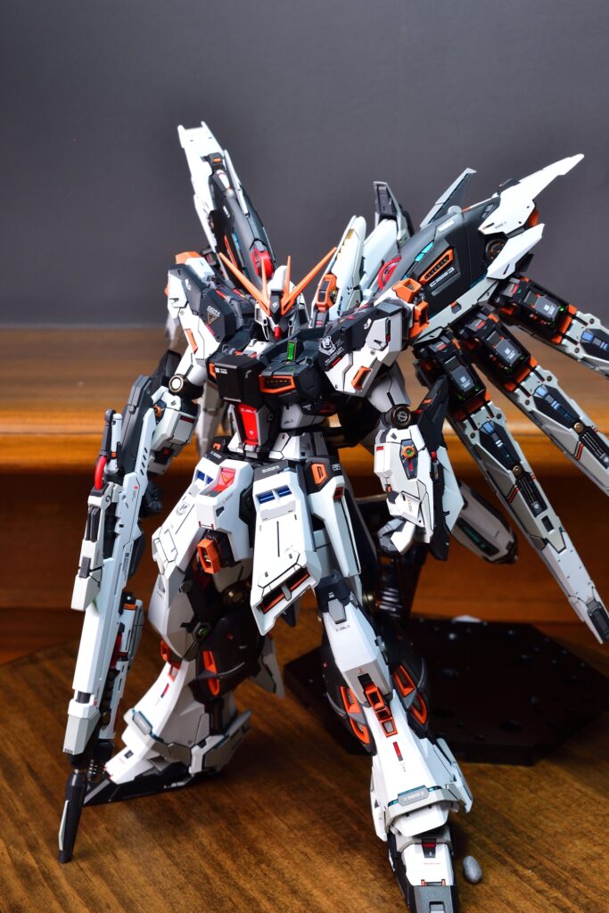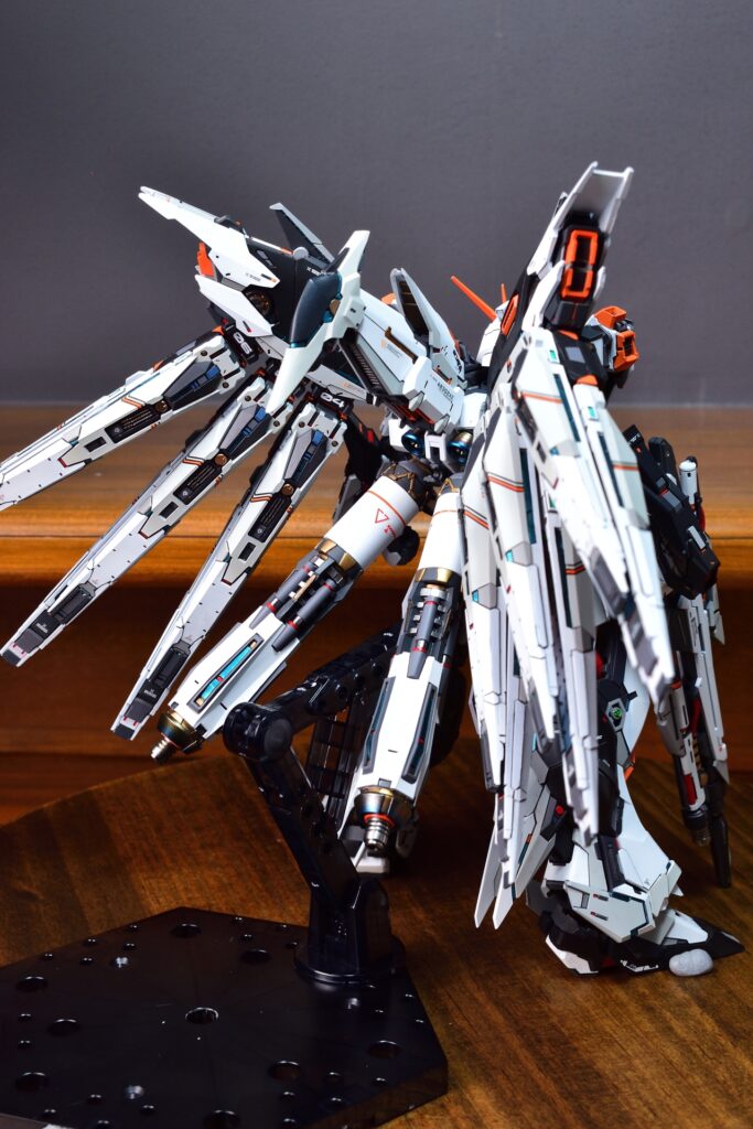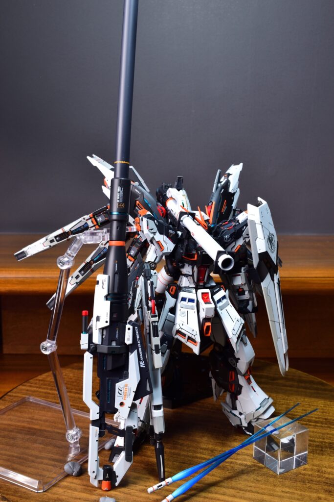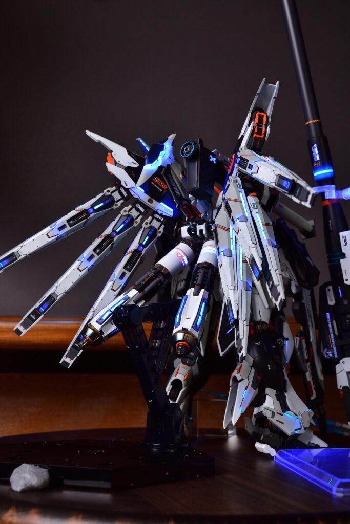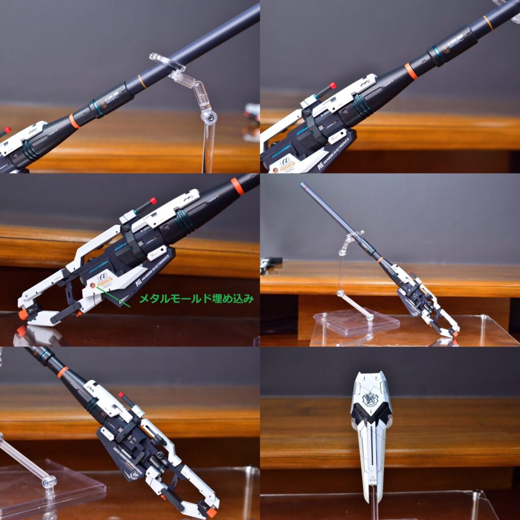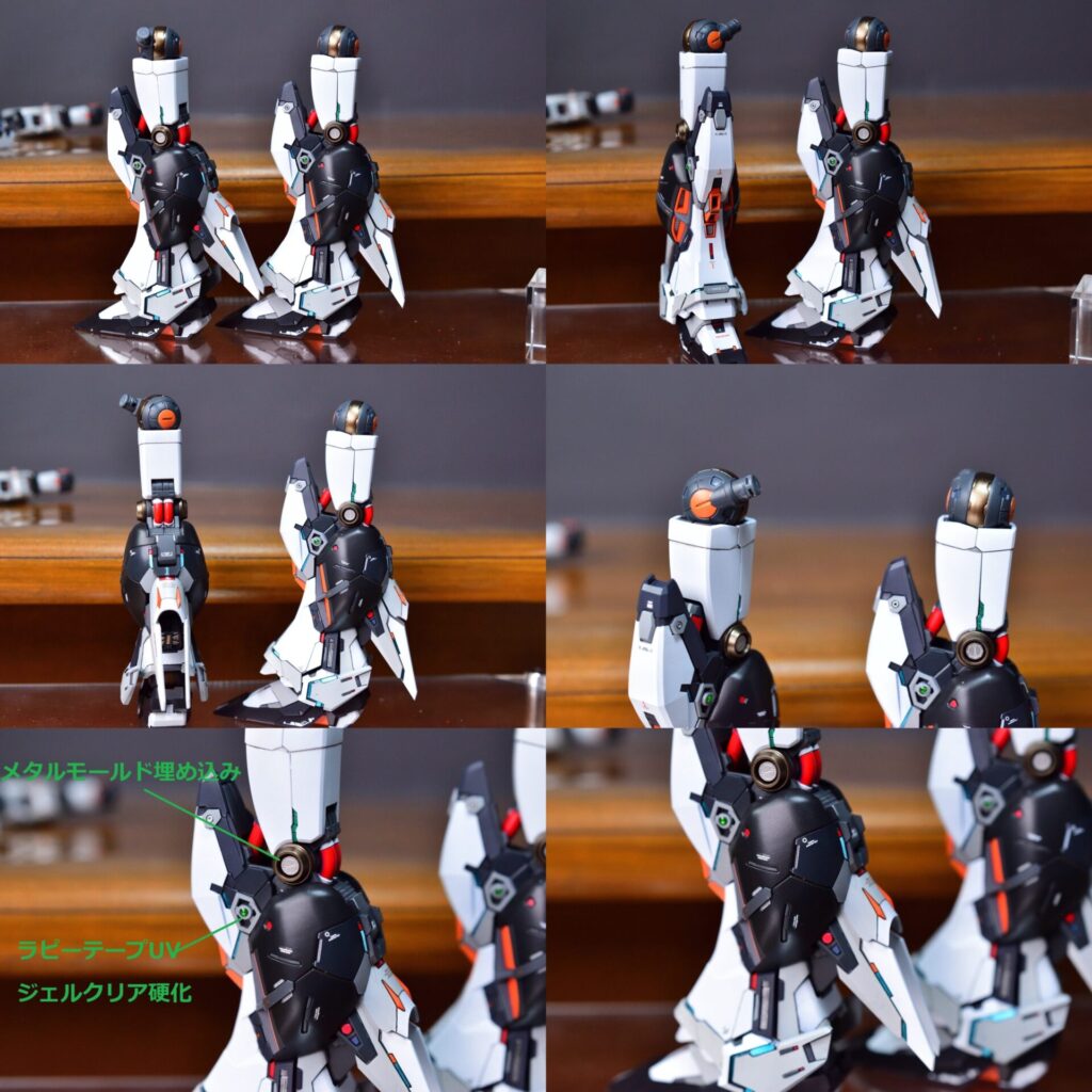 細かい改造箇所やこだわりポイントは画像に記載しておりますので、そちらをご覧ください。特にファンネルやプロペラントタンクのアレンジ、蛍光塗装による発光表現など、ぜひ細部をお楽しみください!