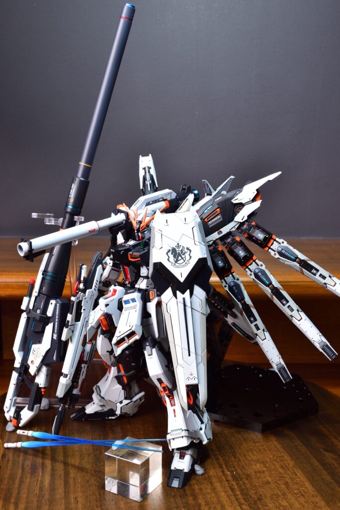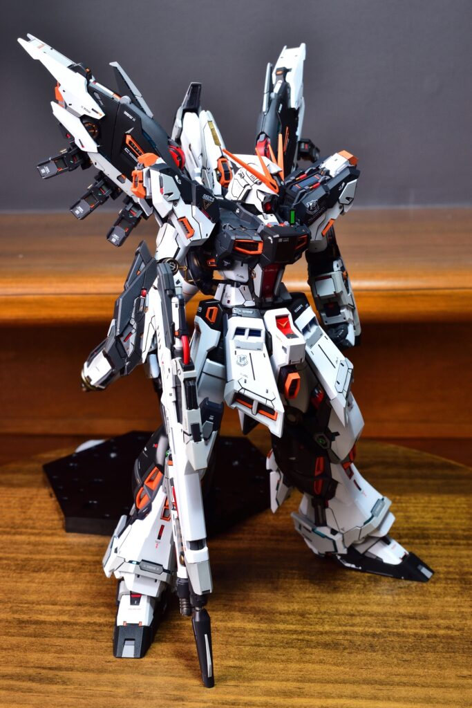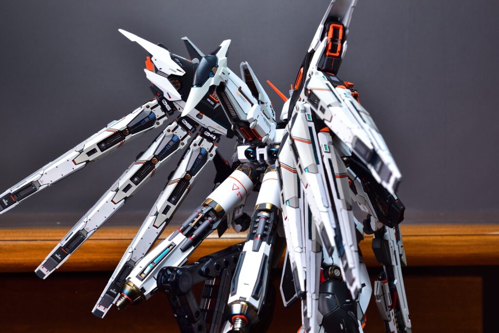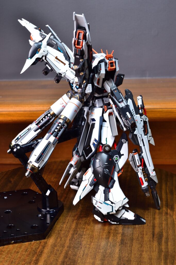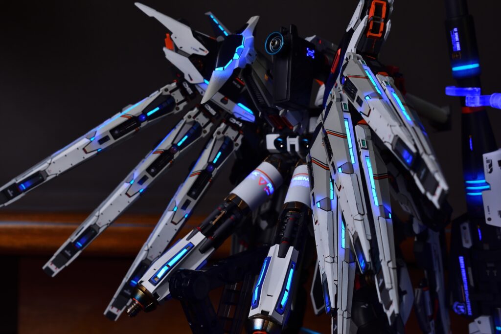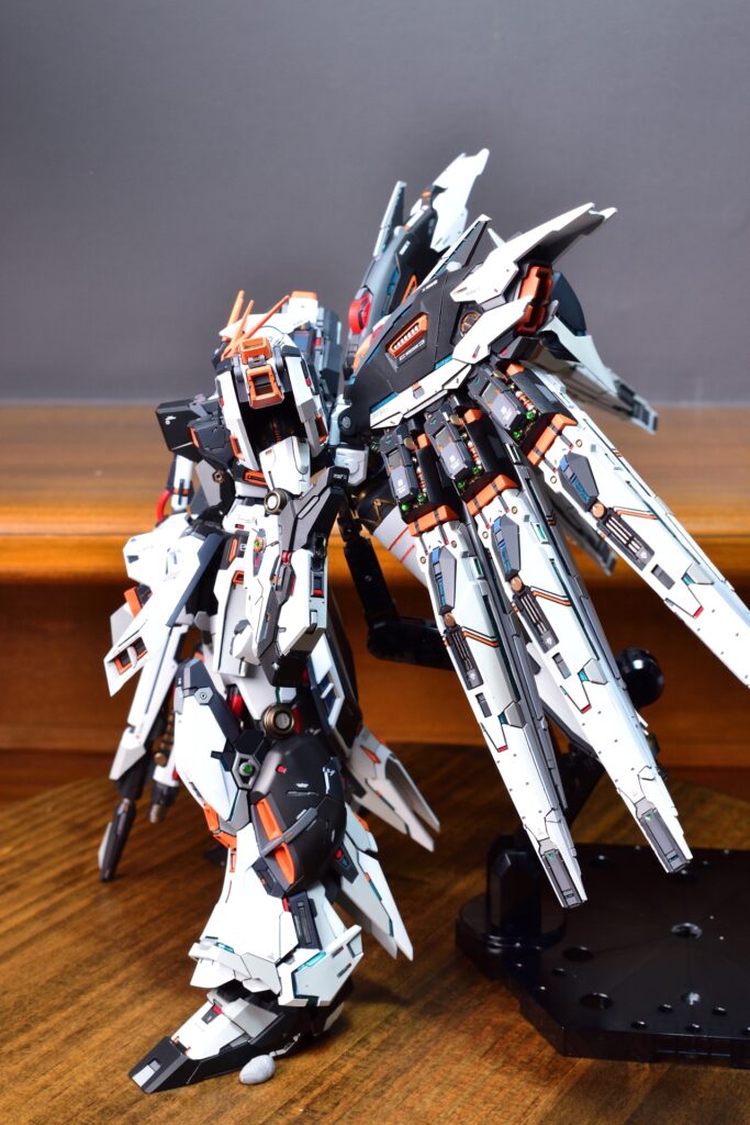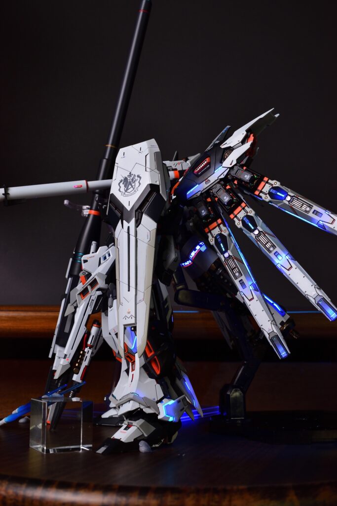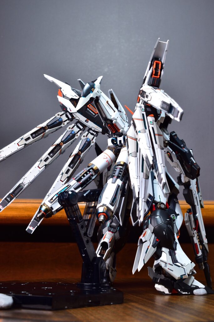 細かい改造箇所やこだわりポイントは画像に記載しておりますので、そちらをご覧ください。特にファンネルやプロペラントタンクのアレンジ、蛍光塗装による発光表現など、ぜひ細部をお楽しみください!