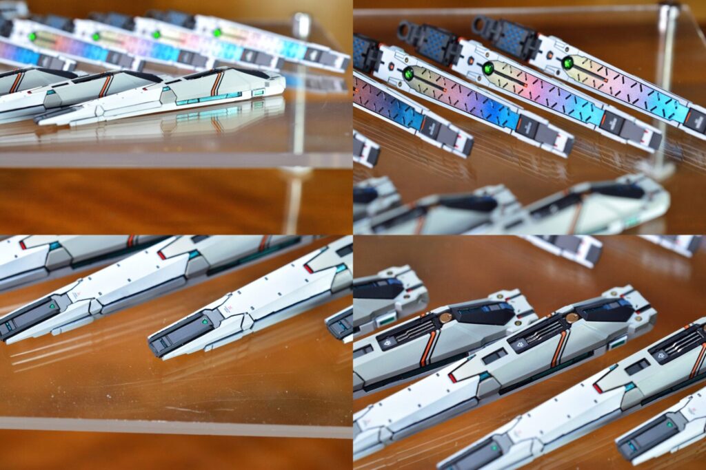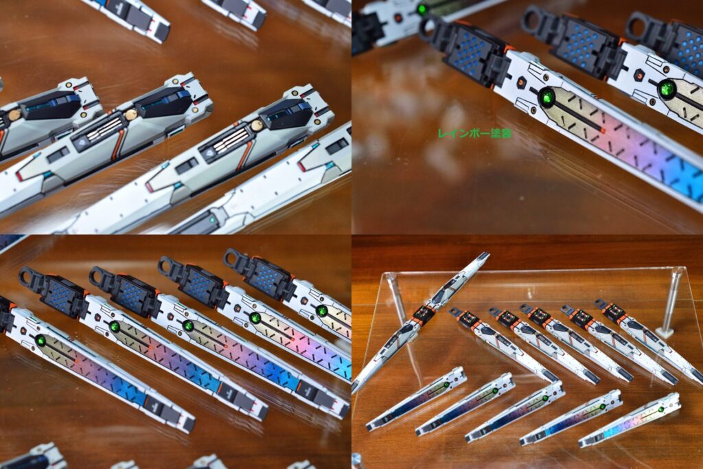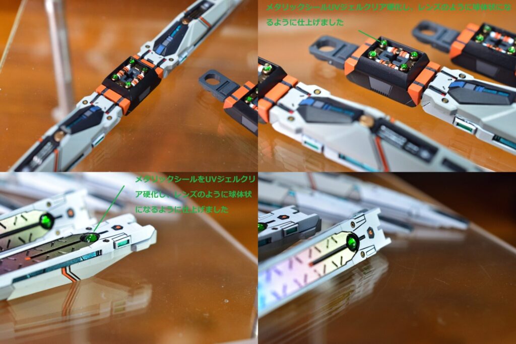 ファンネルは今回も最大の見せ場として、細部まで丁寧に制作しました。モールドの塗り分けはもちろん、レインボー塗装を施し、メタリックシールをUVジェルで封印。さらに、球体状に仕上げるために2回に分けてジェルを盛り、レンズのような美しい仕上がりにしました。 - プロペラントタンクの調整