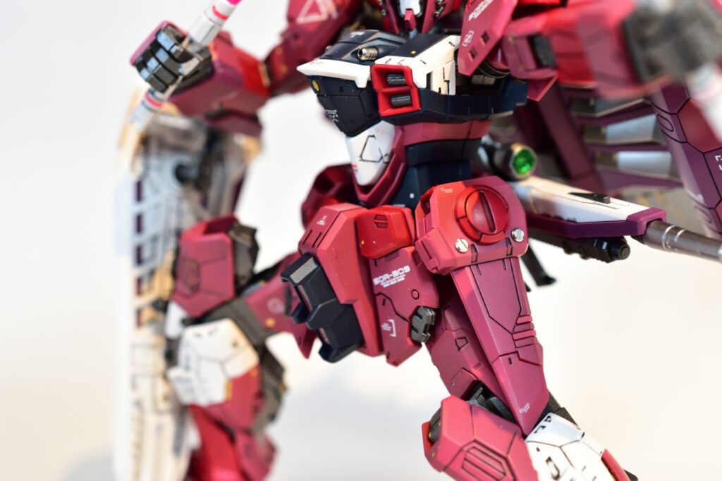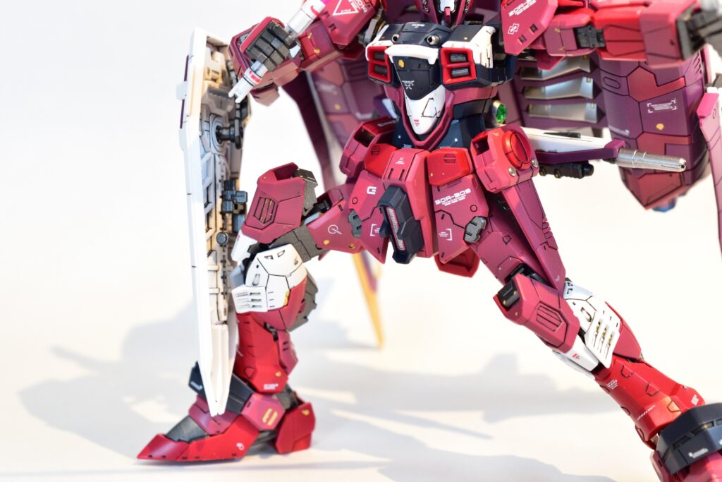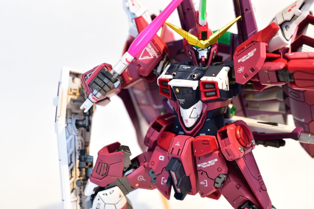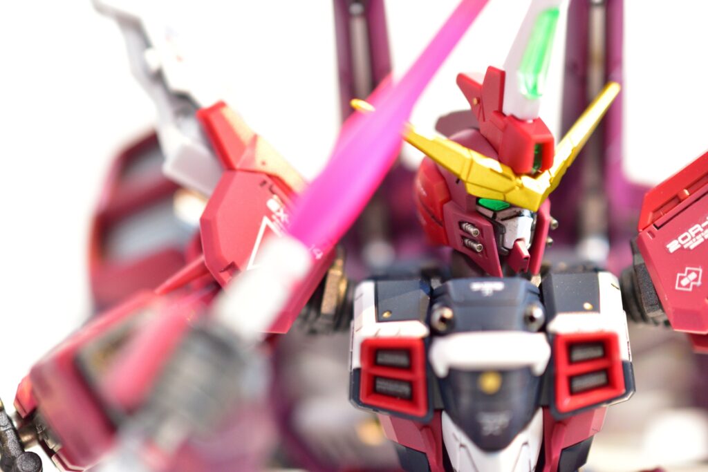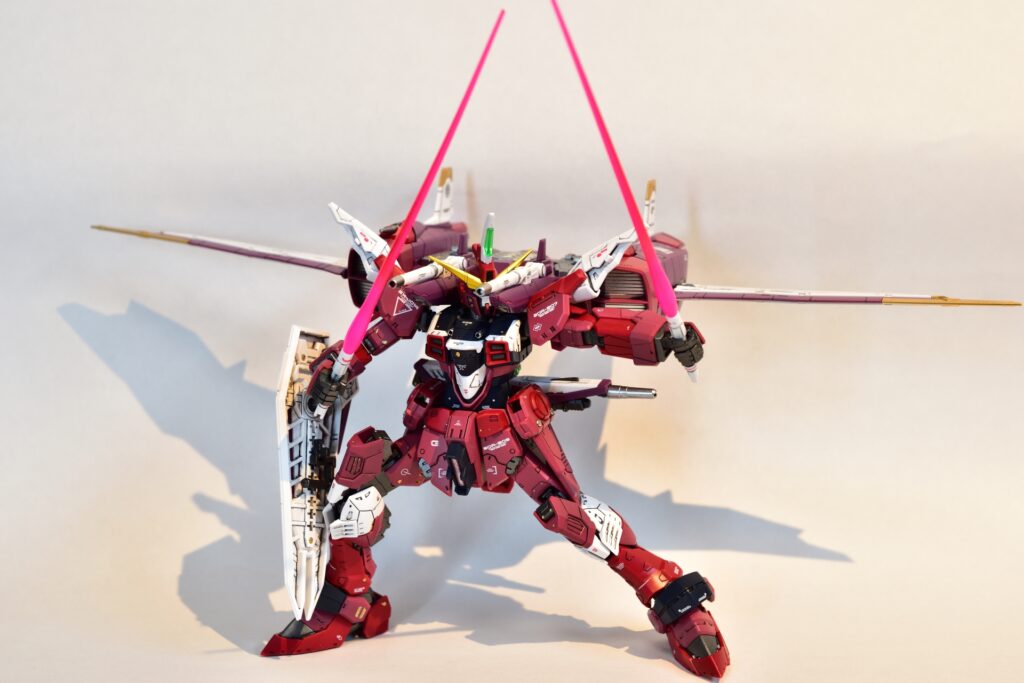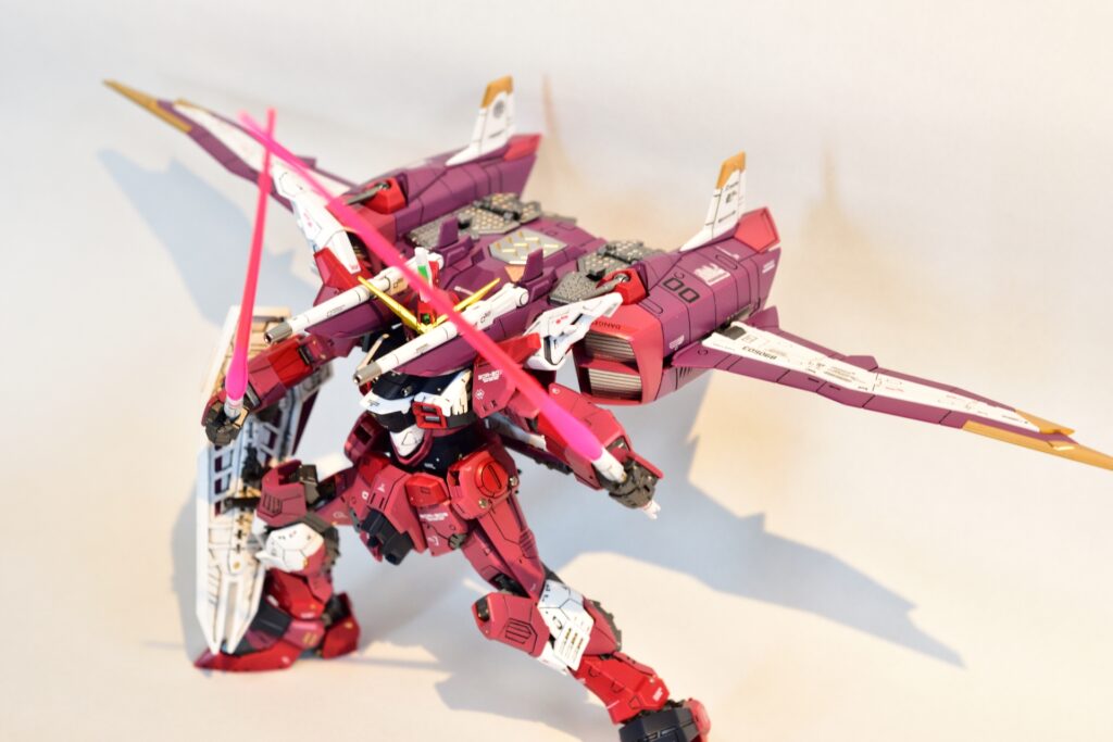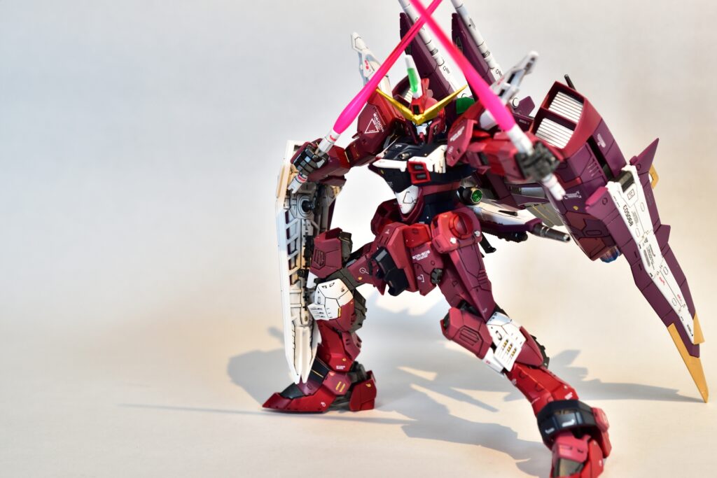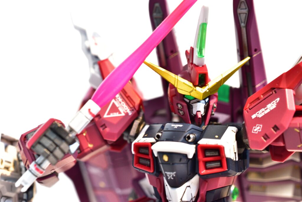 今回制作したのは、RGジャスティスガンダムです。カラーリングは原作のイメージを再現しつつ、各所に手を加えて完成度を高めました。特にビームサーベルはグラデーション塗装を施し、発光しているような鮮やかな表現を意識しました。