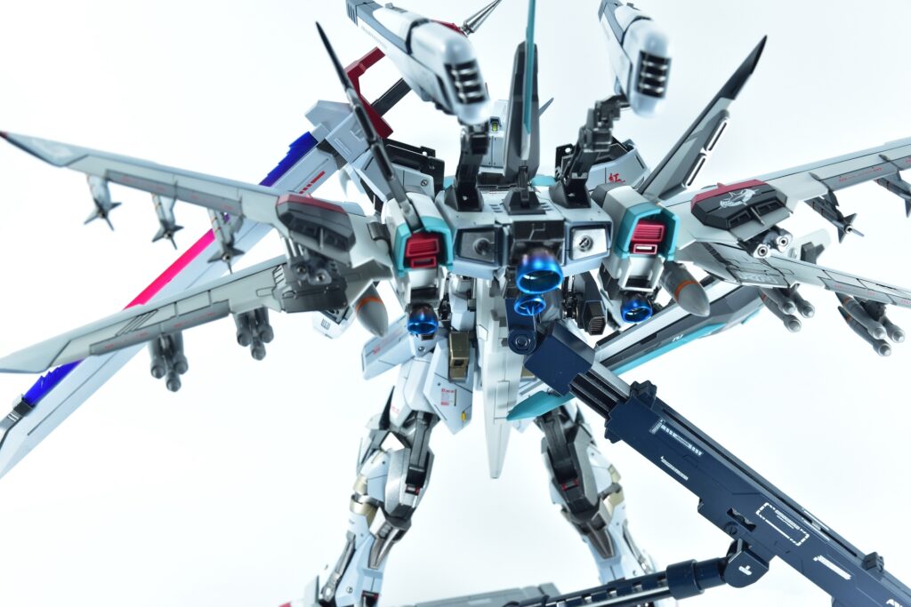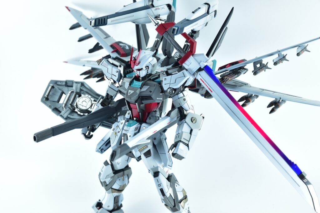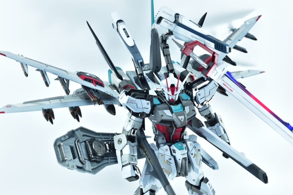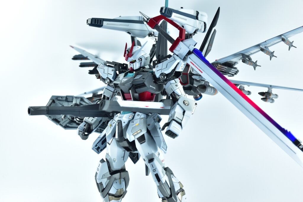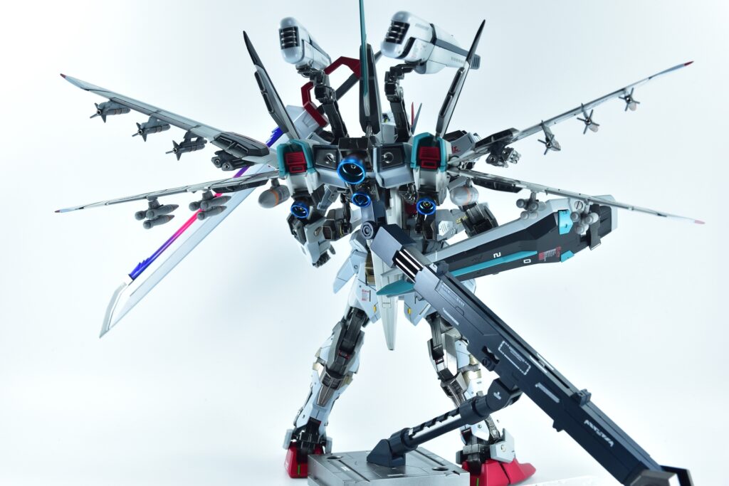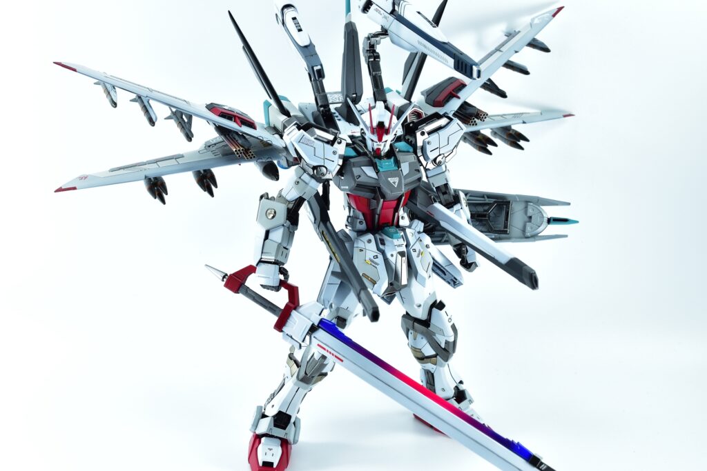 MGストライクルージュは、可動性と火力を向上させるために改修し、オオトリ装備の強化とフルミサイルユニットの搭載で戦闘能力を大幅に向上させました。腰部の改造で立ち姿がより自然になり、ツインヴェスバーやフルミサイルユニットの追加で火力面も強化されています。塗装やディテール処理に工夫を凝らし、重厚感と精密感を両立した仕上がりとなりました。
