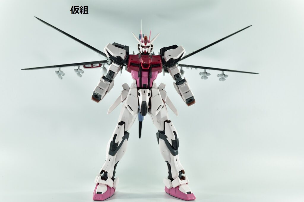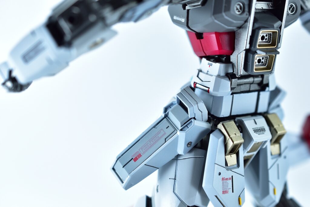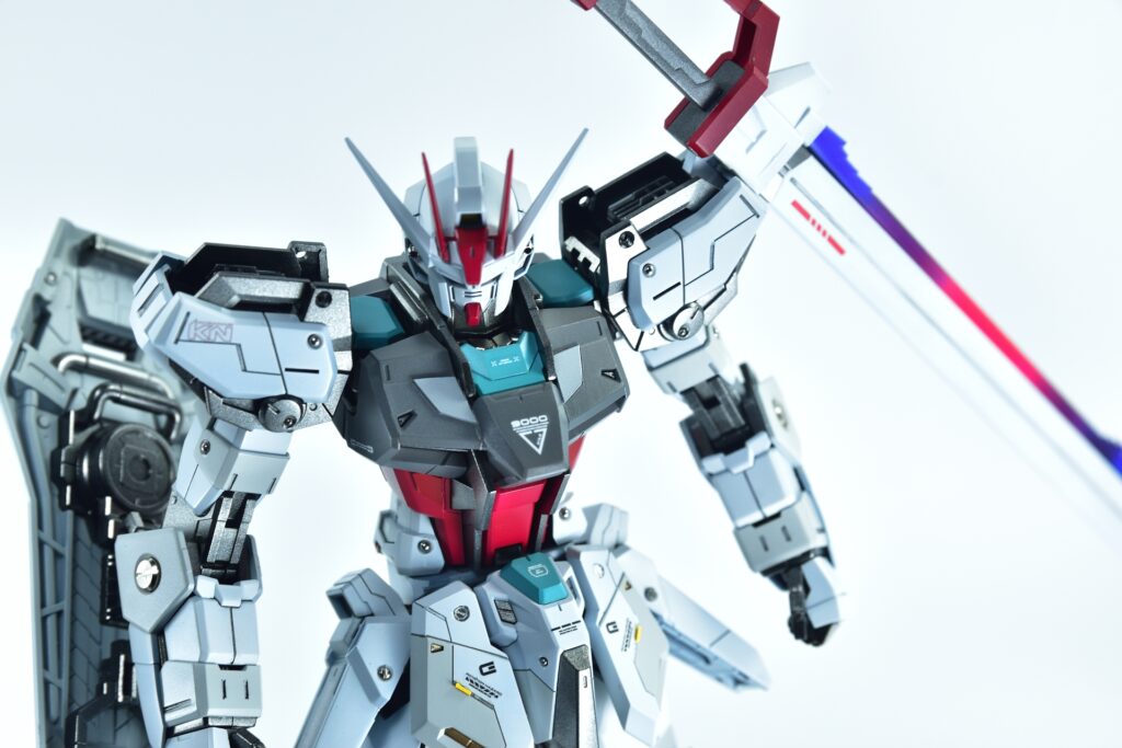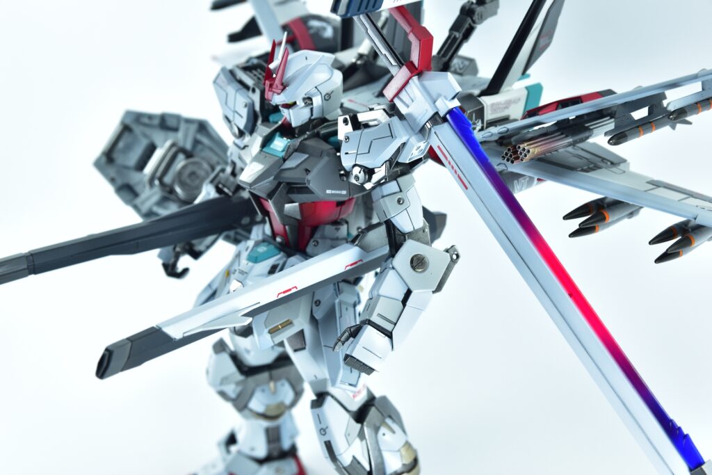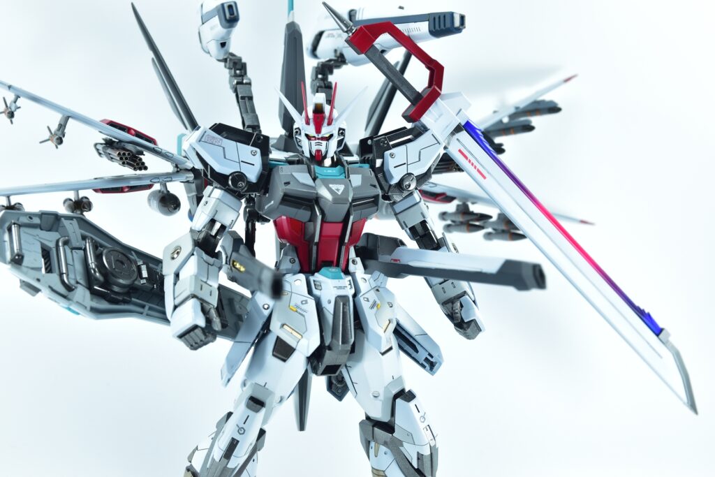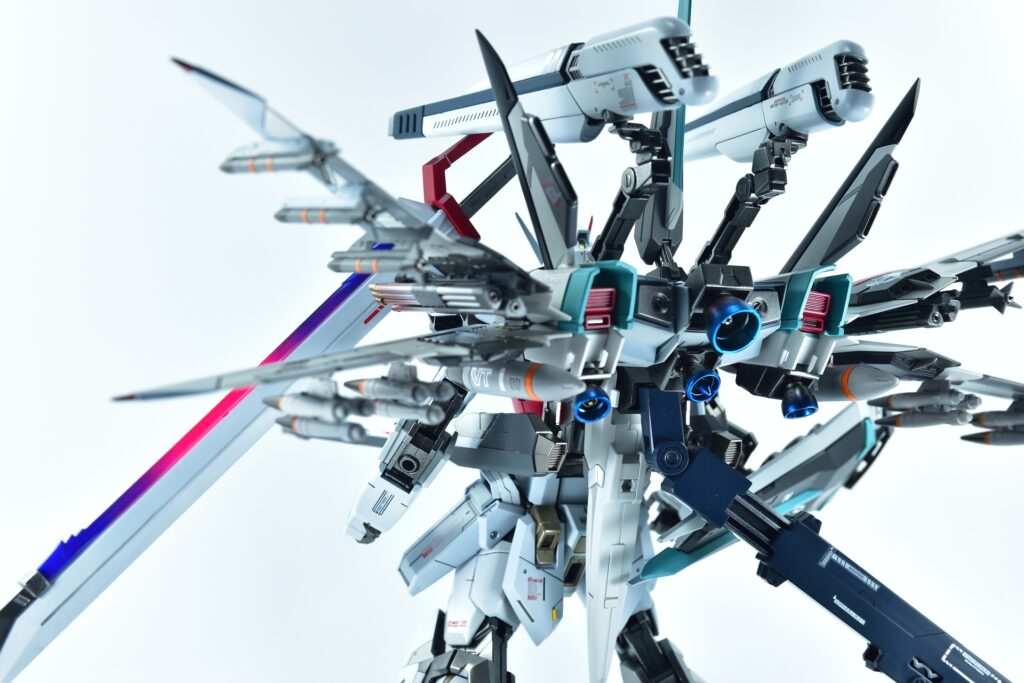 MGストライクルージュは、可動性と火力を向上させるために改修し、オオトリ装備の強化とフルミサイルユニットの搭載で戦闘能力を大幅に向上させました。腰部の改造で立ち姿がより自然になり、ツインヴェスバーやフルミサイルユニットの追加で火力面も強化されています。塗装やディテール処理に工夫を凝らし、重厚感と精密感を両立した仕上がりとなりました。