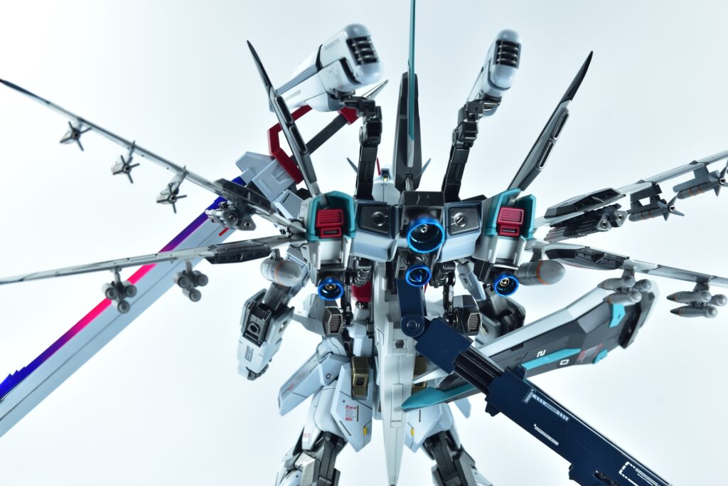 今回はMGストライクルージュをベースに、オオトリ装備の強化に加えてフルミサイルユニットを搭載し、さらに火力と機動力を向上させた機体を制作しました。テーマは「強化」しつつ、オリジナルのデザインを尊重しながらも、より戦闘的な外観と機能性を追求しました。