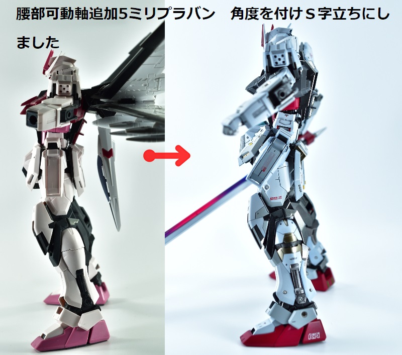 • 腰部に可動軸を一箇所追加し、5ミリの延長を行ってS字立ちができるように改造。これにより、ポージングがより自然で動きやすくなりました。